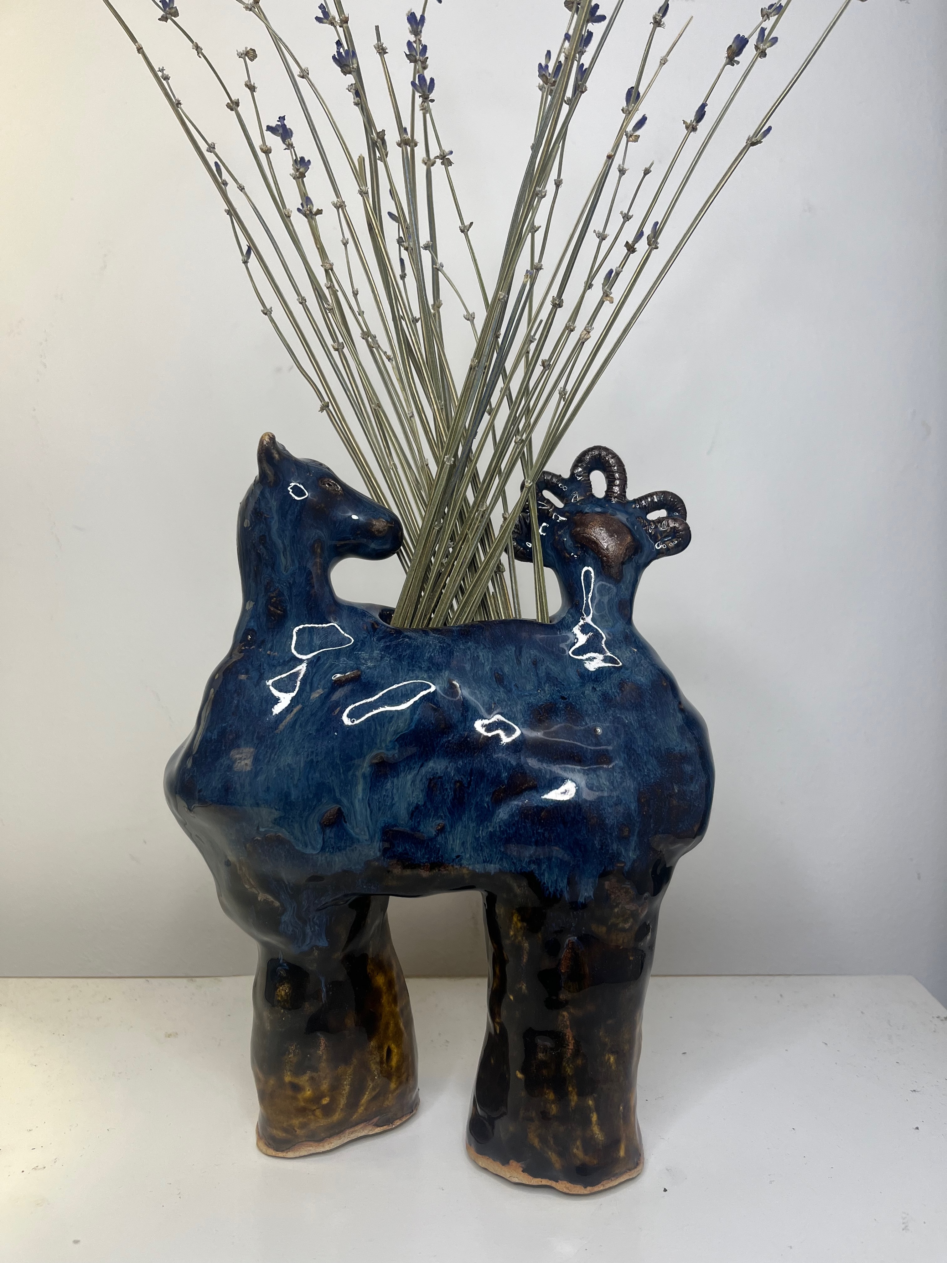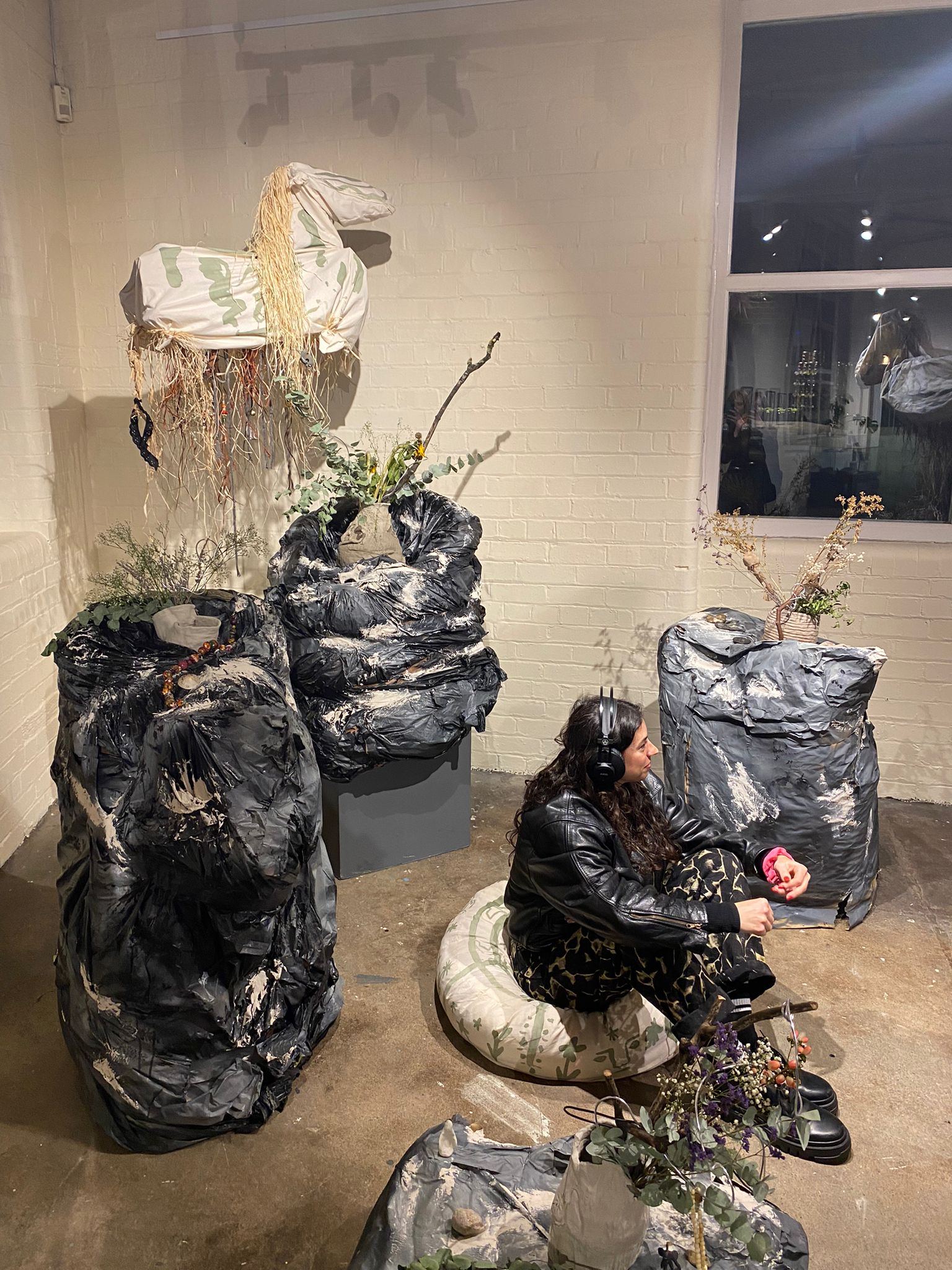 Songs My Mother Never Got to Sing to Me explores stories of the black uterus through fabric and clay. The work, inspired by personal events, looks at the prevalence of uterine fibroids in Black women and the tendency to have their symptoms ignored for so long that only severe options such as hysterectomies are available. The work looks for a place of healing and wonders how we can be gentle with this pain and uses the clay and fabric to explore the past, present and a future healed mythology of generational trauma.